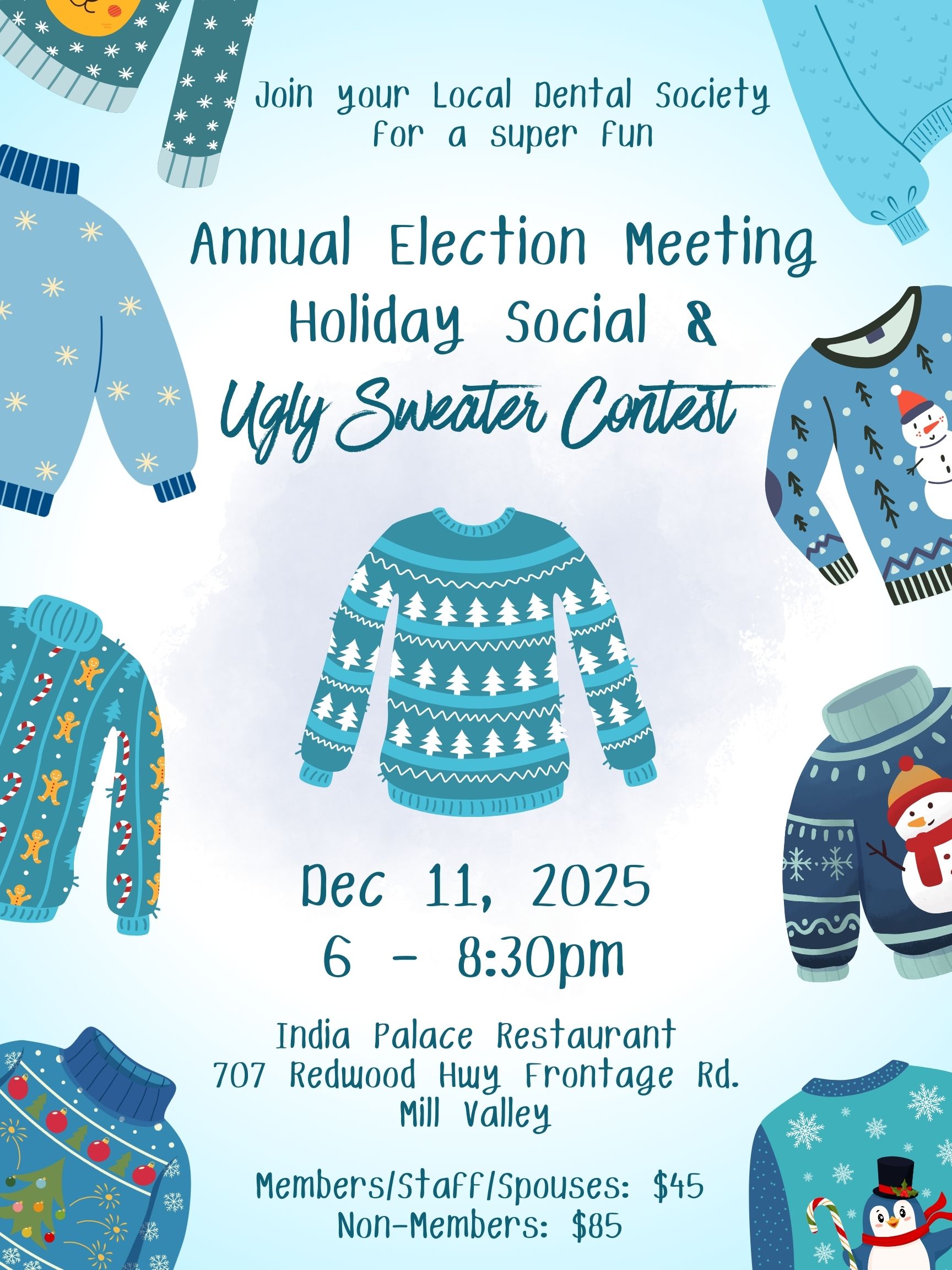 Secure your spot today! Your ticket includes the full family-style dinner, non-alcoholic beverages, and entry into the Ugly Sweater Contest.